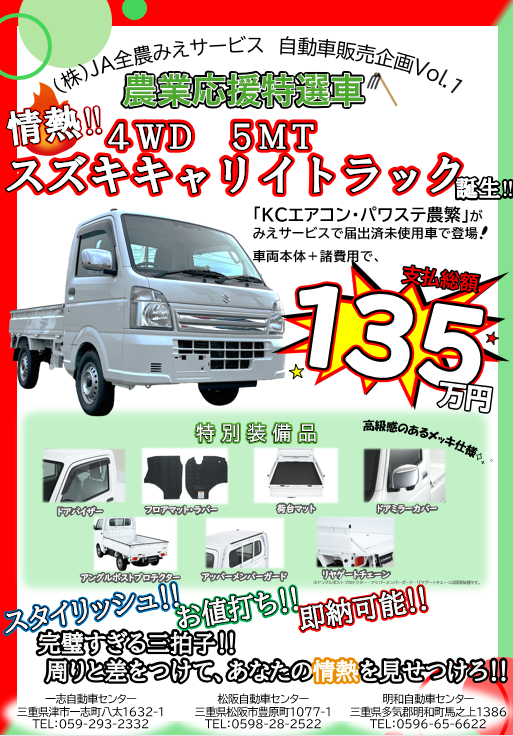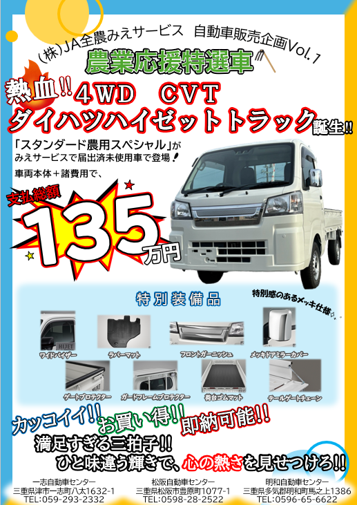 令和2025年11月8日(土)~11月9日に開催される感謝祭「まつり2025~暮らしアップデート~」に先立ち、ダイハツはハイゼットトラック、スズキはキャリィトラックを株式会社JA全農みえサービス特別仕様で大販売します。その名も「熱血!!ダイハツハイゼット」と「情熱!!スズキキャリィ」です。
