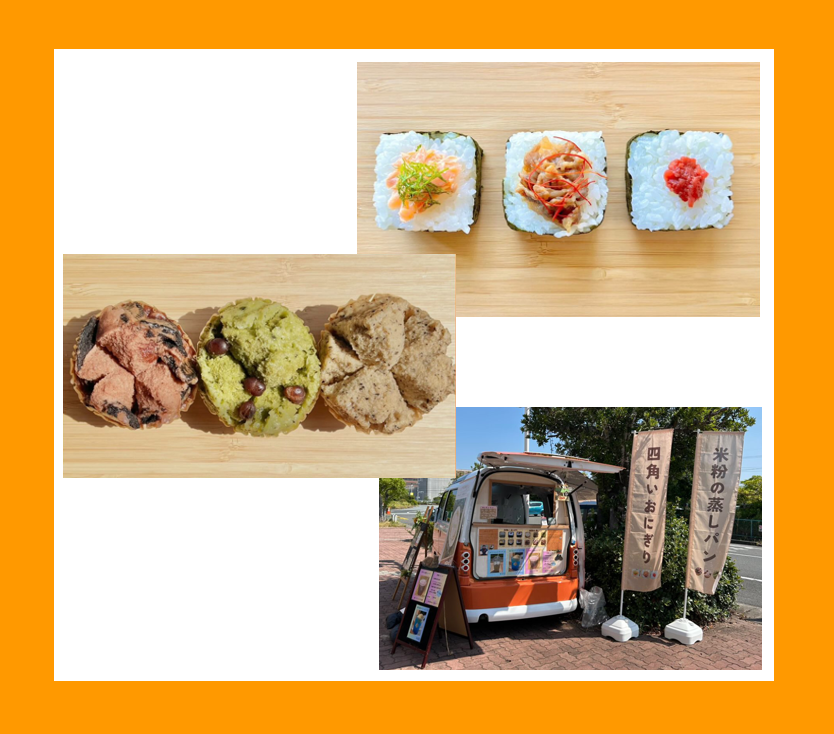 四角いおにぎりと米粉の蒸しパンを販売しているオレンジのキッチンカーです。