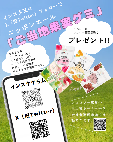 イベント当日に、株式会社JA全農みえサービスのインスタグラム又は、X(旧ツイッター)フォローで、ニッポンエール「ご当地果実グミ」プレゼント!!